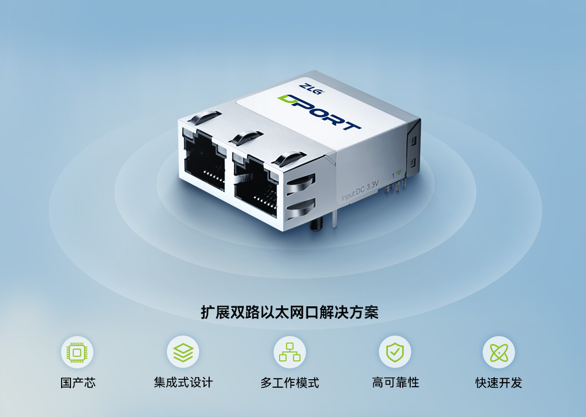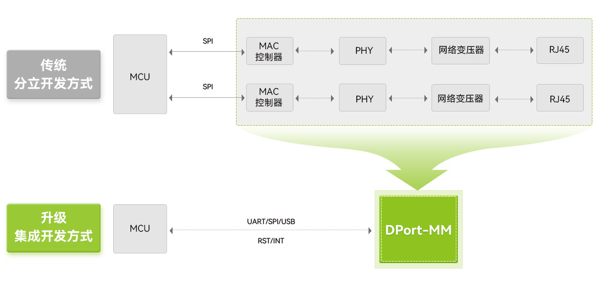 DPort -MM是四合一集成式双路透传模块,将MCU、PHY、网络变压器、RJ45插座高集成度封装。用户只需完成MCU和DPort-MM的连接,轻松实现嵌入式以太网。