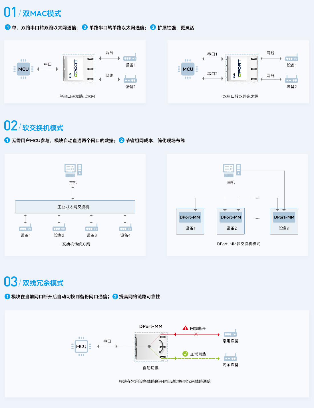 | 工作模式 | 双MAC模式、软交换机模式、双线冗余模式 |